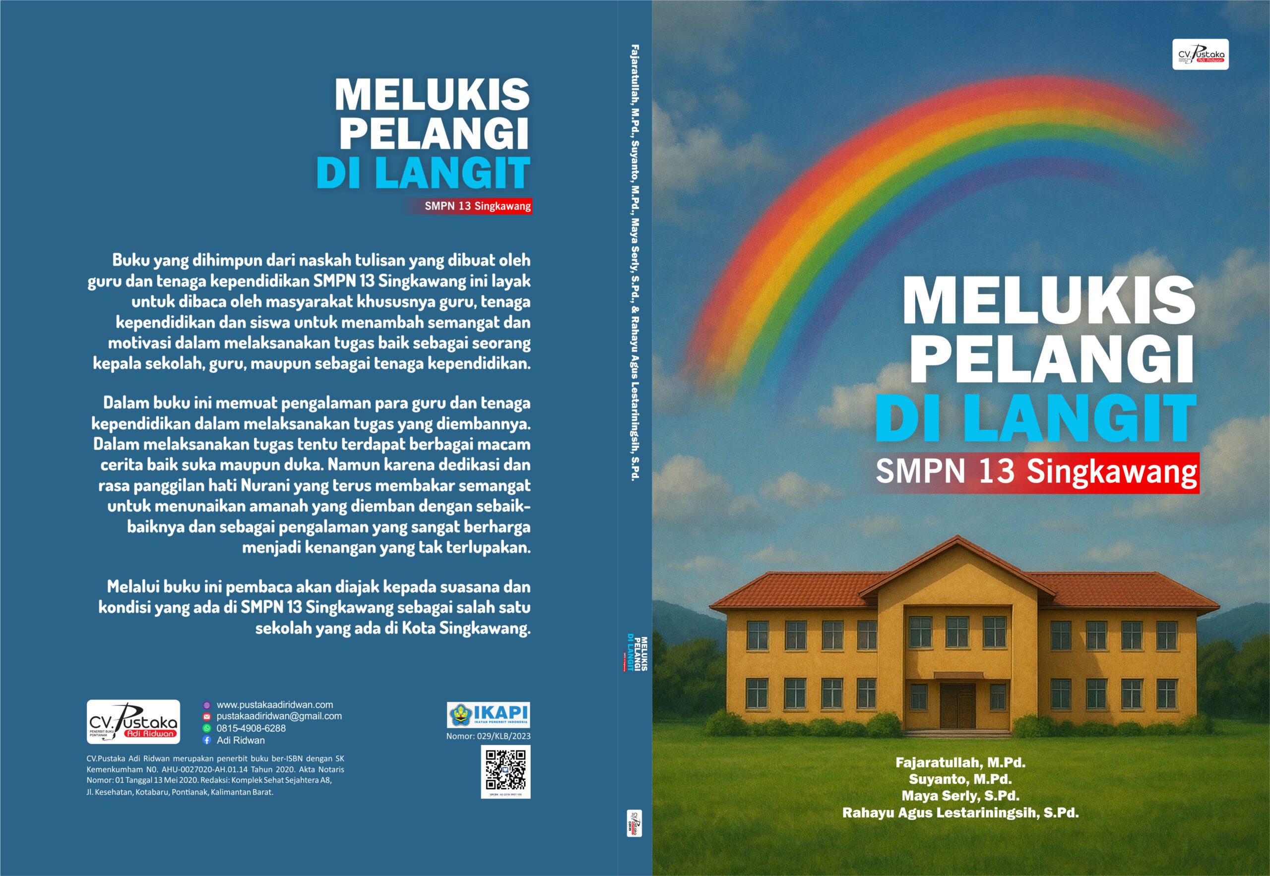 | Sinopsis | Buku berjudul “Melukis Pelangi di Langit SMPN 13 Singkawang”. Melalui karya-karya dalam buku ini, diharapkan dapat meningkatkan literasi dan dibaca oleh para siswa sehingga siswa dapat semakin menghargai jerih payah yang telah dilakukan oleh para guru dalam mendidik dan juga tenaga kependidikan dalam pelayanan sehingga timbul rasa patuh dan hormat. Selain itu melalui penulisan buku ini dapat menjadi motivasi dan inspirasi bagi siapapun yang membacanya. |